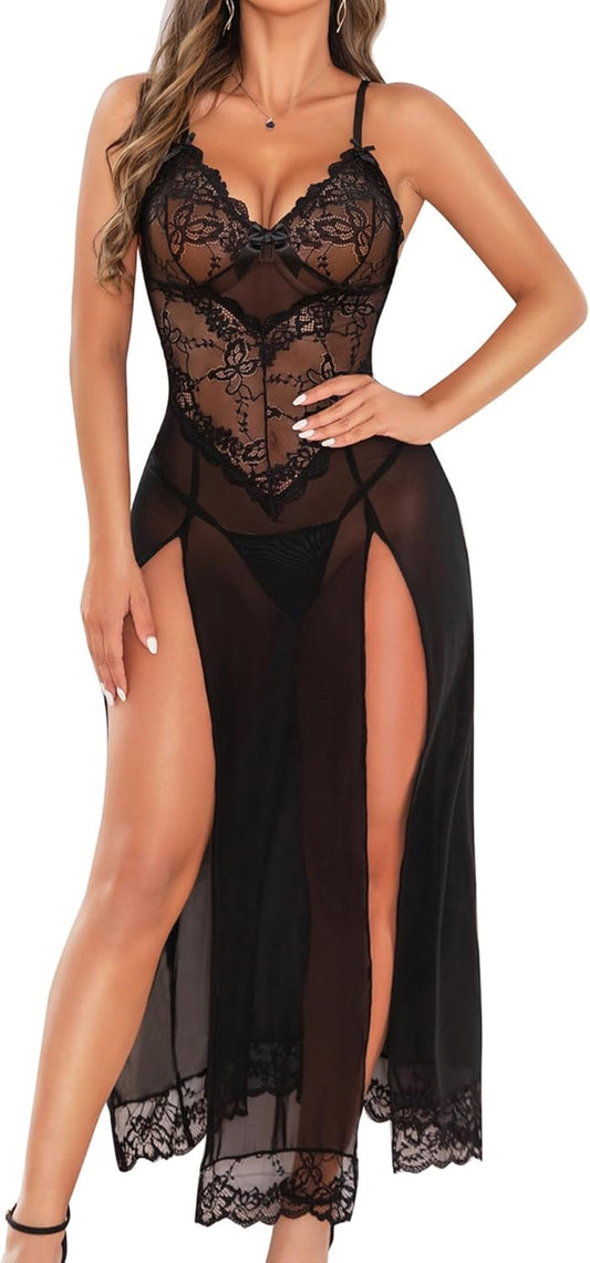 Women's Lace Chemise Nightdress & G-String – Long Mesh Babydoll Lingerie (Bridal, Maternity-Friendly Nightgown)