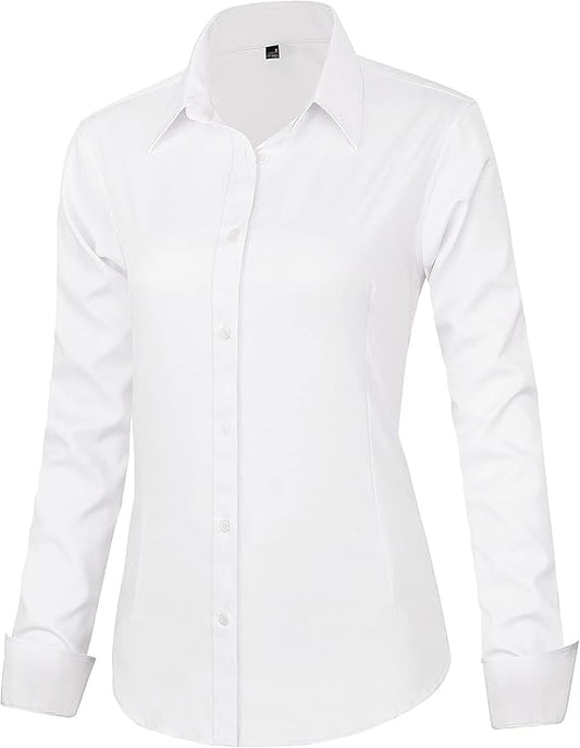Women's Long Sleeve Plain Dress Shirt Fitted Stretch Executive Office Business Casual Shirt Blouse with Single Cuff