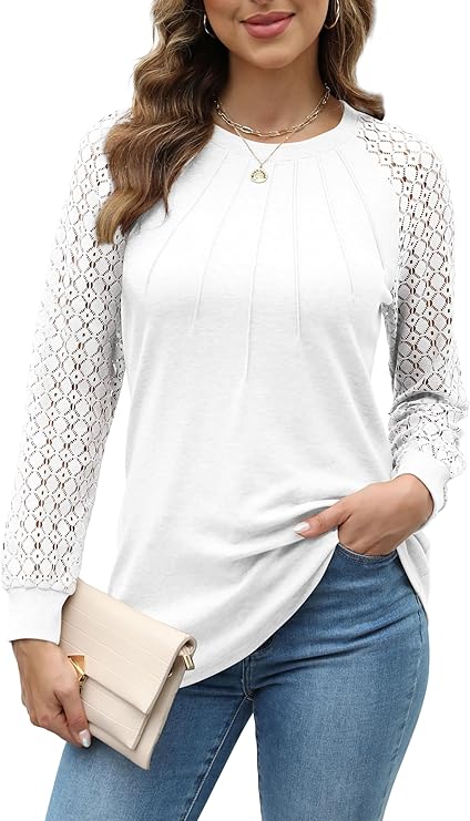 Womens Tops Ladies Tops Lace Long Sleeve Crew Neck Pleated Shirt Long Sleeve Tops Women