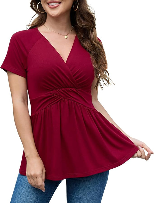 Womens V Neck Baby Doll Peplum Tops Short Sleeve Tunic Blouse Casual Wear for Going Out Sizes S-2XL