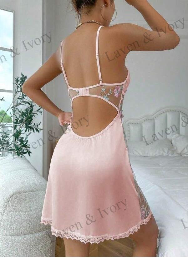 Crafted from a soft blend of 95% Polyester & 5% Elastane, this camisole-style mini dress features semi-sheer mesh panels, embroidered floral lace, and a delicate spaghetti strap neckline. The bow accent and slim fit design add a hint of elegance and seduction – ideal for hot nights in or lounging in style.
